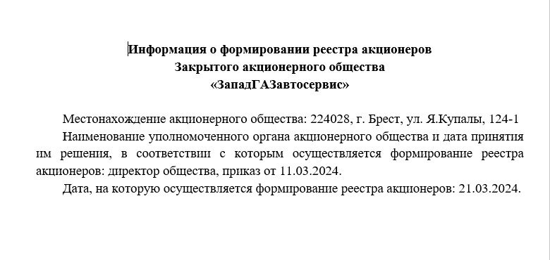26.03.2024 Информация о формировании реестра акционеров Закрытого акционерного общества «ЗападГАЗавтосервис» 10,43 КБ