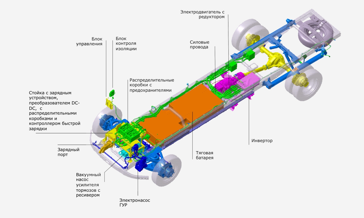 Электрическая «ГАЗель» сочетает в себе унифицированные компоненты модельного ряда легких коммерческих автомобилей ГАЗ и оригинальные электрические узлы: тяговые батареи, электродвигатель, преобразователь напряжения, зарядное устройство и другие компоненты.